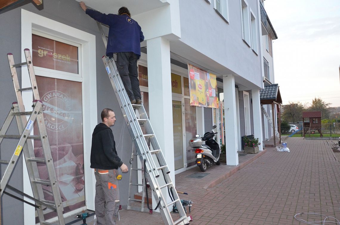 Montaż kamery na fasadzie budynku handlowegow Pucku